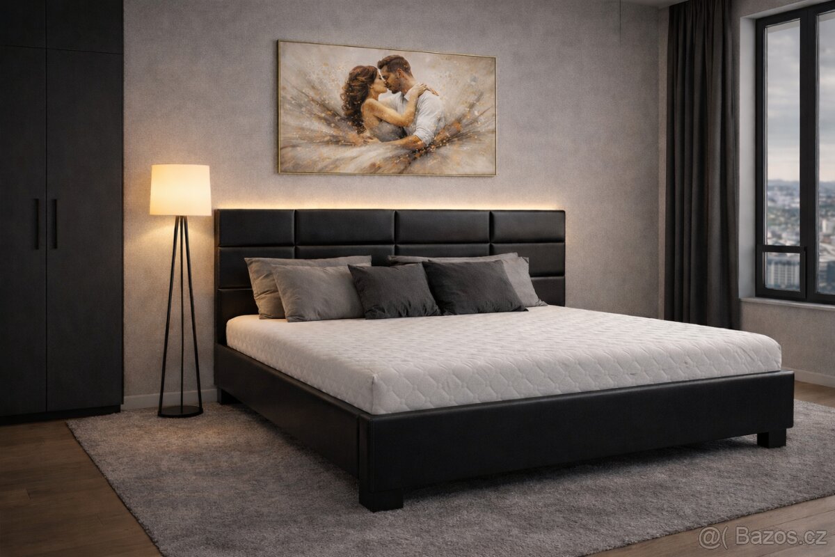 Moderní nové dvoulůžko-designová postel z Eco kůže černé barvy o rozměru 160x200cm včetně lamelových roštů a matrace vcelku H3 s hypoalergením potahem vysoké kvality. Možnost zakoupit i v bílém provedení. Vnější rozměr postele : Délka 215cm šířka 169cm, výška čela 88cm. Spací plocha 160x200cm. Možnost dopravy a sestavení na domluvě. Ihned k dispozici.