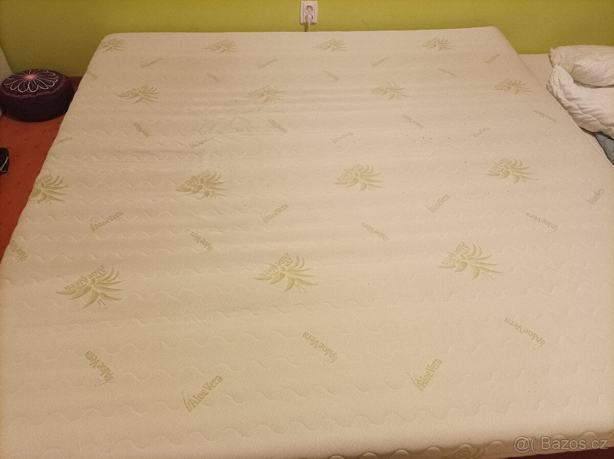 Prodám postel z palet, přírodní dřevo, rozměr 200x200cm + matrace 200x200x17cm, používané cca 1,5 roku. Na matraci potah s drobným žmolíkem od používání. Prodej ideálně dohromady. PC postele 4880,-Kč, matrace 4599,-Kč. Cena za komplet 5000,-Kč
