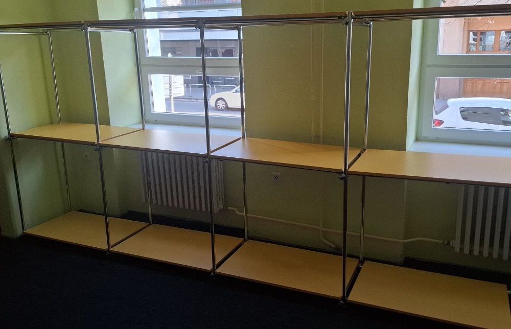 Prodám chromovaný policový systém 5m široký 1,86m vysoký hloubka 55cm.
