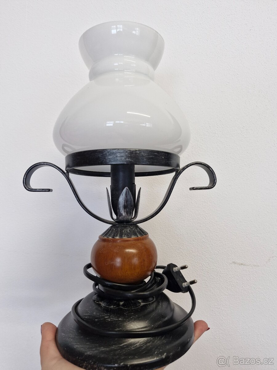 Prodám stolní stojací lampičku v retro rustikálnim stylu s lehkou patinou, pohledový styl petrolejky. kombinaci materiálů drevo-kov-mléčné sklo cylindru o průměru 11cm. Patice na žárovku(úsporná nebo klasická). cena za kus.