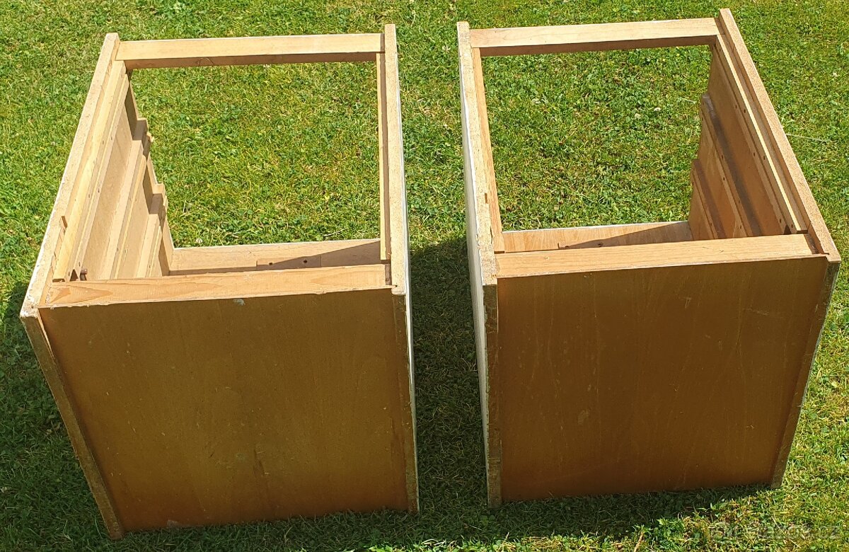 - 2x suplikovy kontejner (korpus vc. spodku pro osazeni noh - drevotriska dyhovana, zadni cast - preklizka, vyztuhy a vedeni pro supliky - masiv), sirka 43 cm x vyska 45.5 cm x hloubka 59 cm bile barvy a dyha drevo