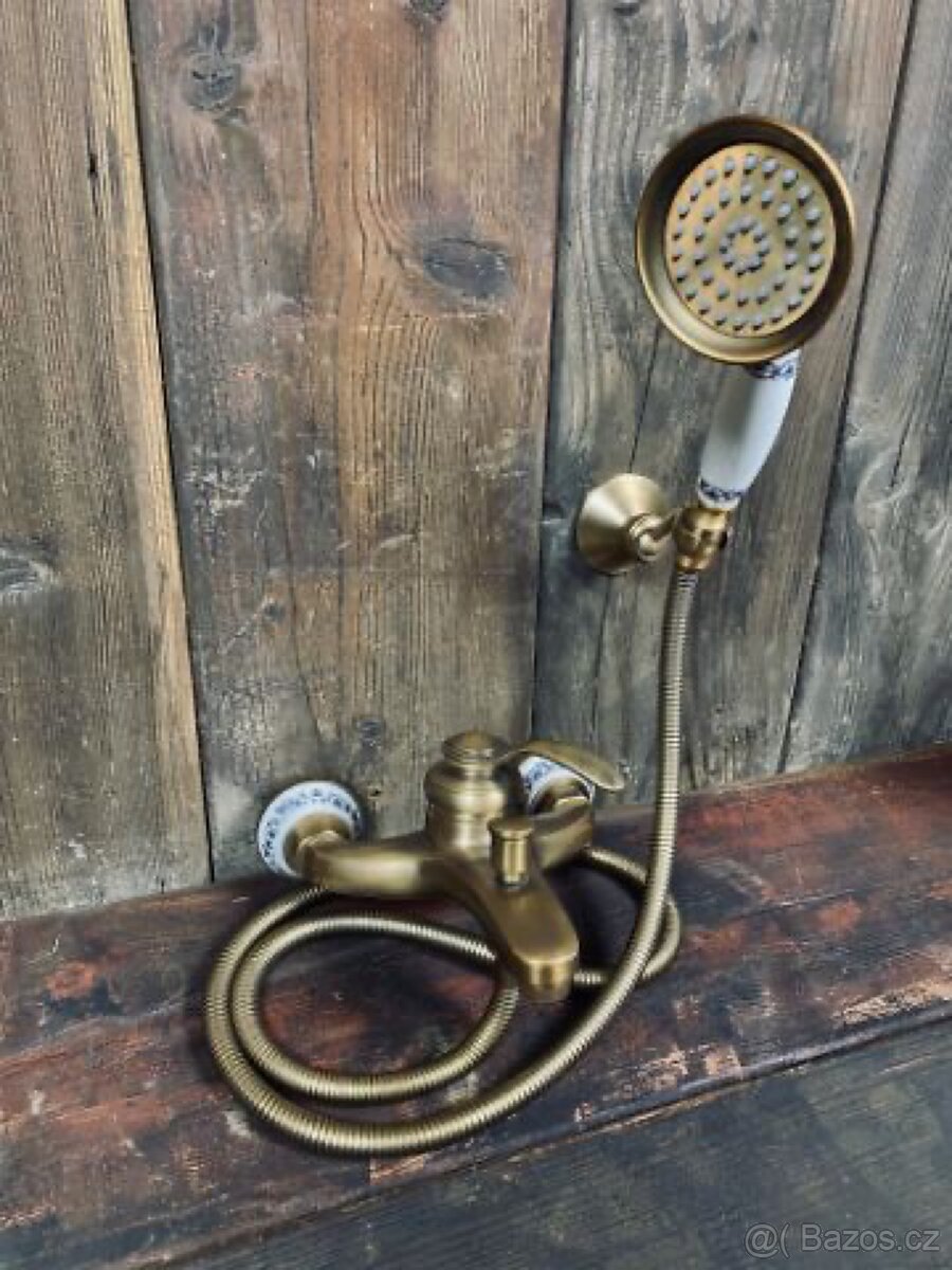 Prodám novou mosaznou vodovodní baterii k vaně. Baterie je celokovová v kombinaci s malovaným porcelánem a má keramické kartuše. Rozteč 15 cm. Nabízím i jiné typy do kuchyní a koupelen a koupelnové doplňky ve stylu. Vše je skladem.