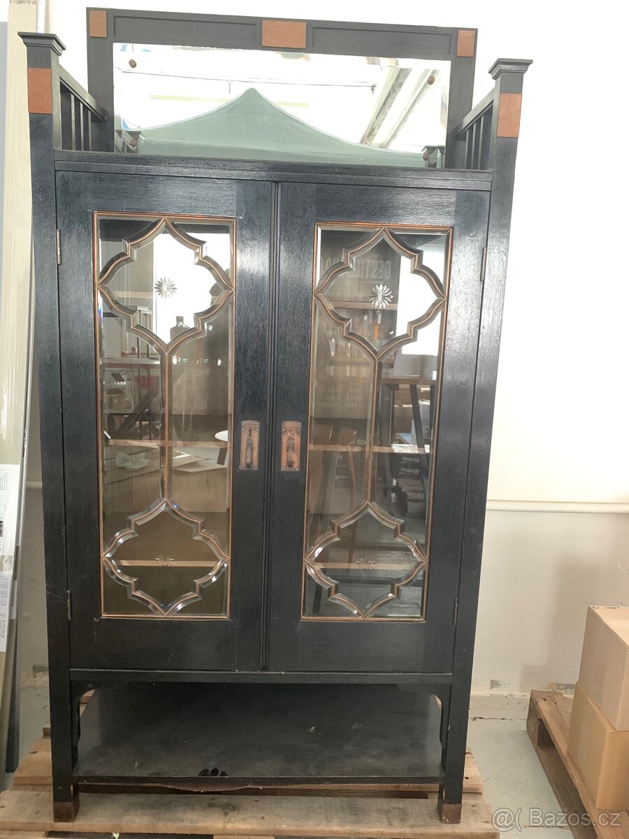 Horní část má 3 prosklené skříňky s policemi, dole jsou 3 zásuvky a 3 uzavřené skříňky. Kvalitní dřevo, původní kování, pevná konstrukce.
