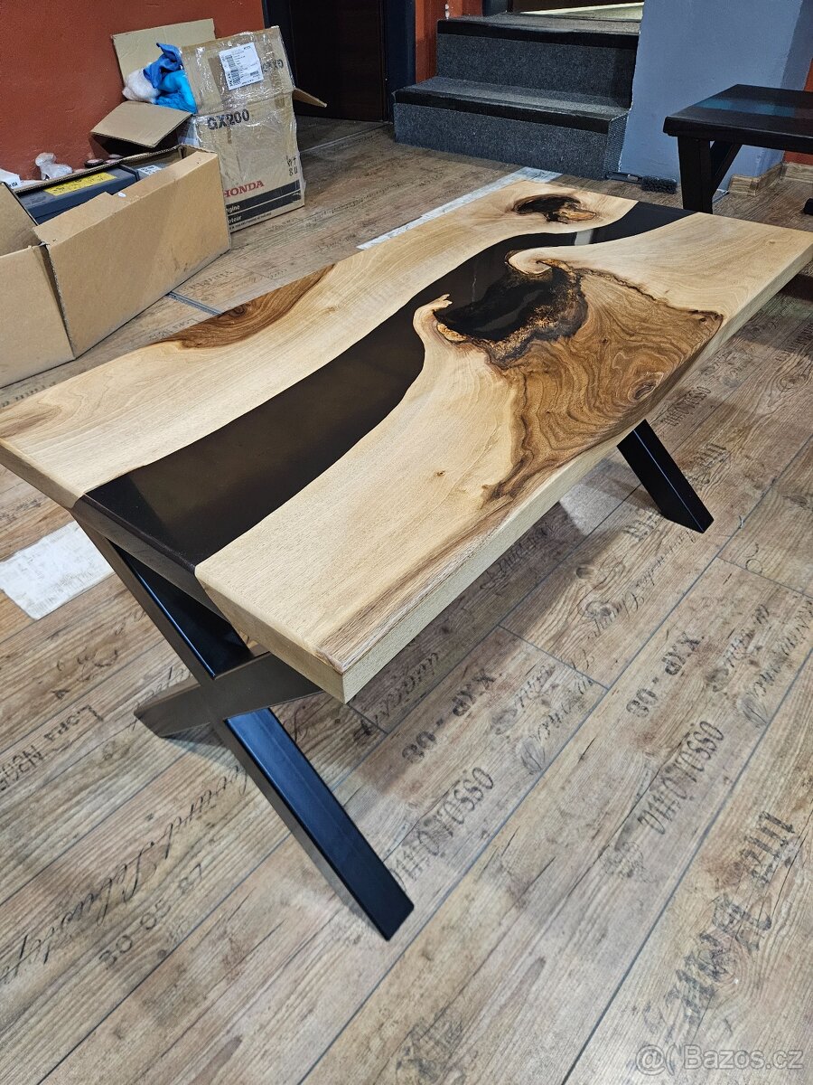 Epoxidovy stul Laguna - [18.3. 2026]Prodám originální konferenční stolek z masivního dubového řezu doplněný epoxidovou pryskyřicí. Jedná se o poctivou ruční výrobu z jednoho kusu dřeva, díky čemuž je každý detail – kresba letokruhů, přirozené praskliny i samotný tvar – naprosto jedineč ...