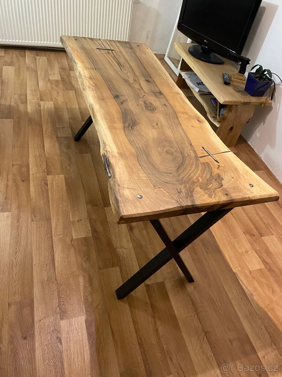 Ořechová deska, praskliny vyplněné černým kytem, ručně zasekané kramle v prasklinách pro minimalizaci pracování dřeva, přidané kovářské hřebíky v hraně a po okrajích pro efekt😉