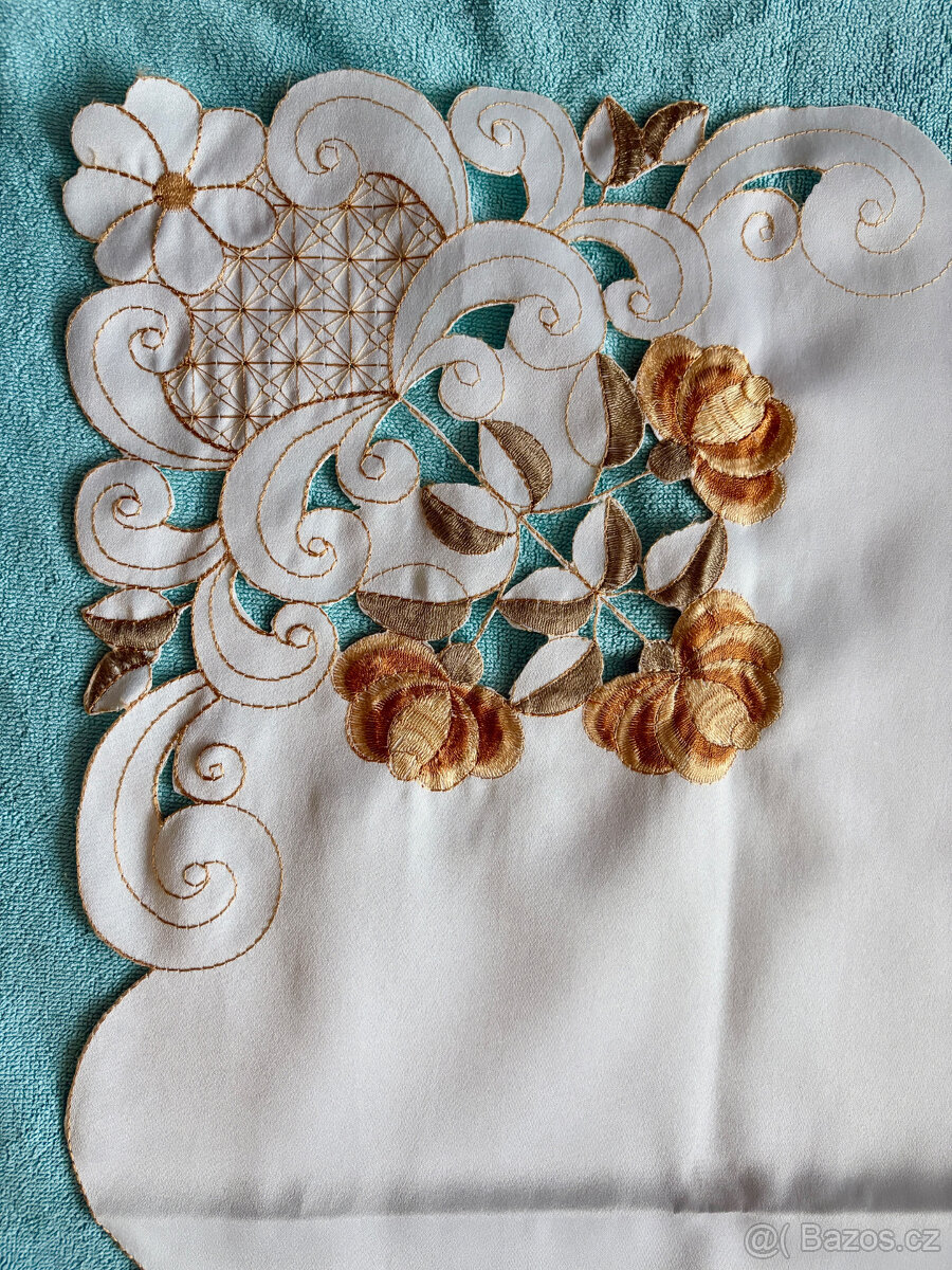 Dva veliké ubrusy z polyesteru se strojovou výšivkou uprostřed a na okrajích. Jeden je bez kazů za 70,-Kč, druhý ubrus zdarma k nákupu - má dva kazy ve výšivce a dvě skvrny.