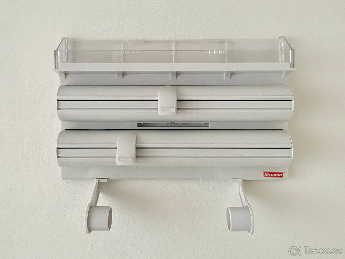Použitý nástěnný držák na fólie a papírové utěrky Tescoma. V případě zájmu pište prosím na email pawel.com@seznam.cz. Tel. číslo je již nefunkční.