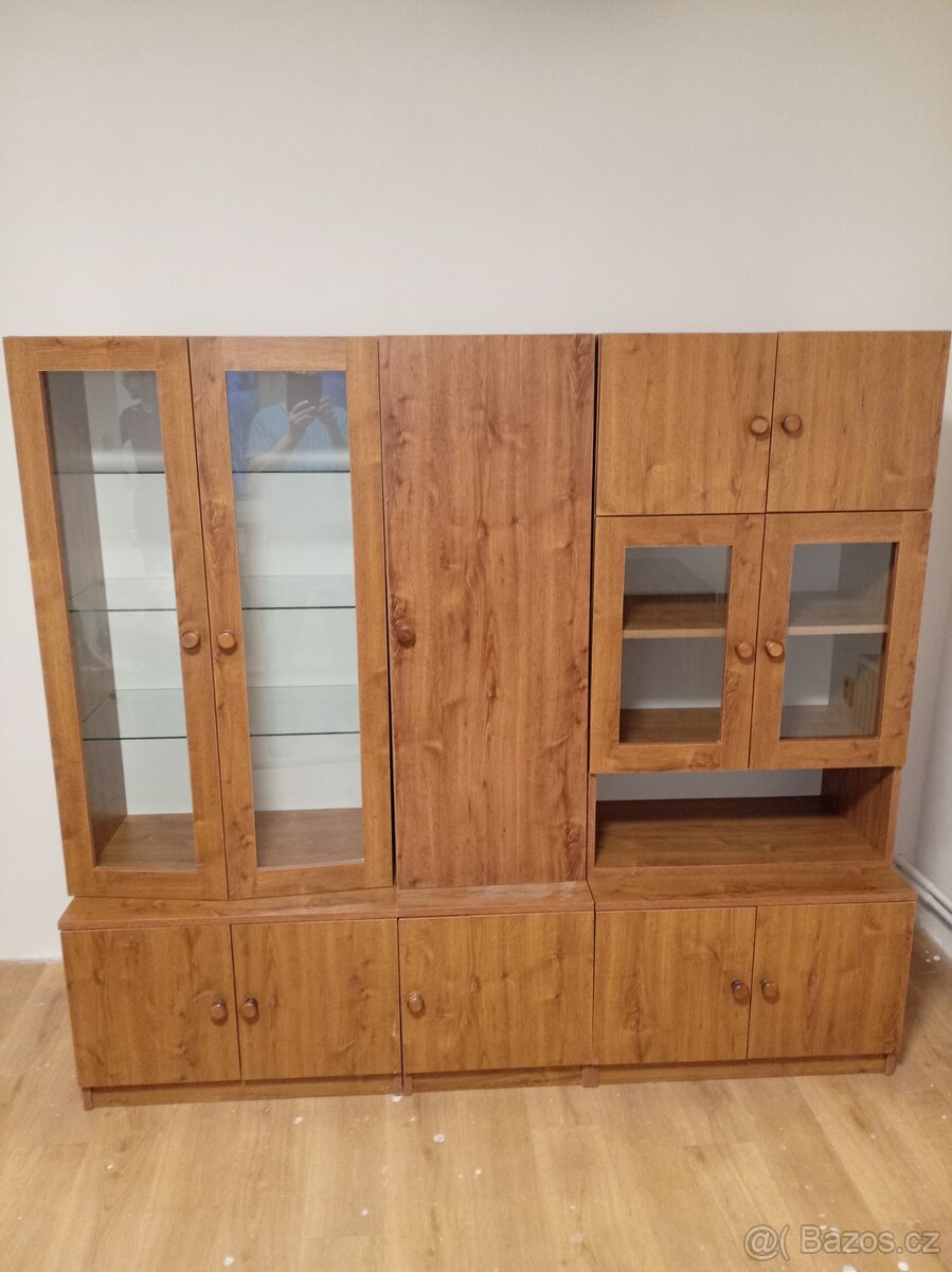 Sestava nábytku včetně prosklené vitríny. Skříňky lze variabilně sestavit.