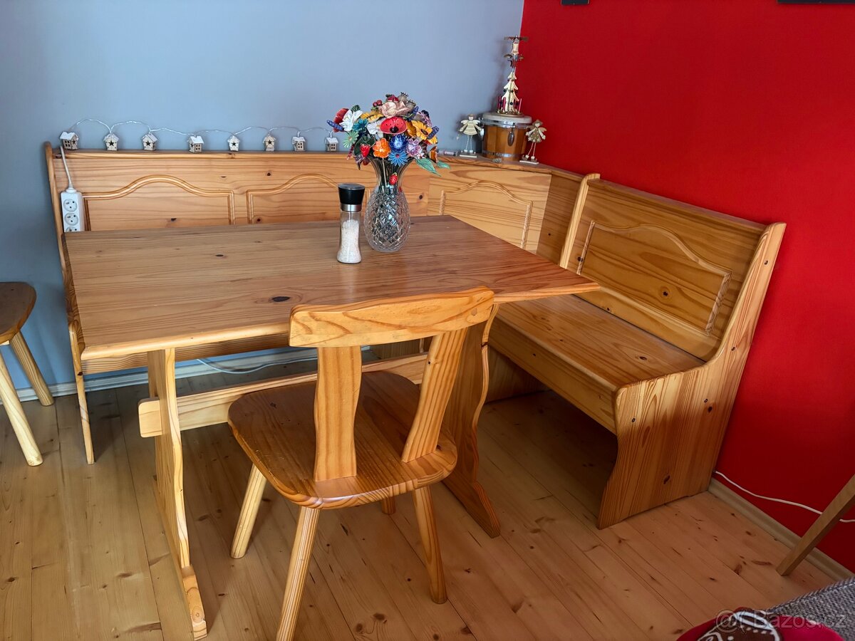Dřevěná lavice s jídelním stolem a jednou židli. V lavici je úložný prostor. Rozměry viz foto.