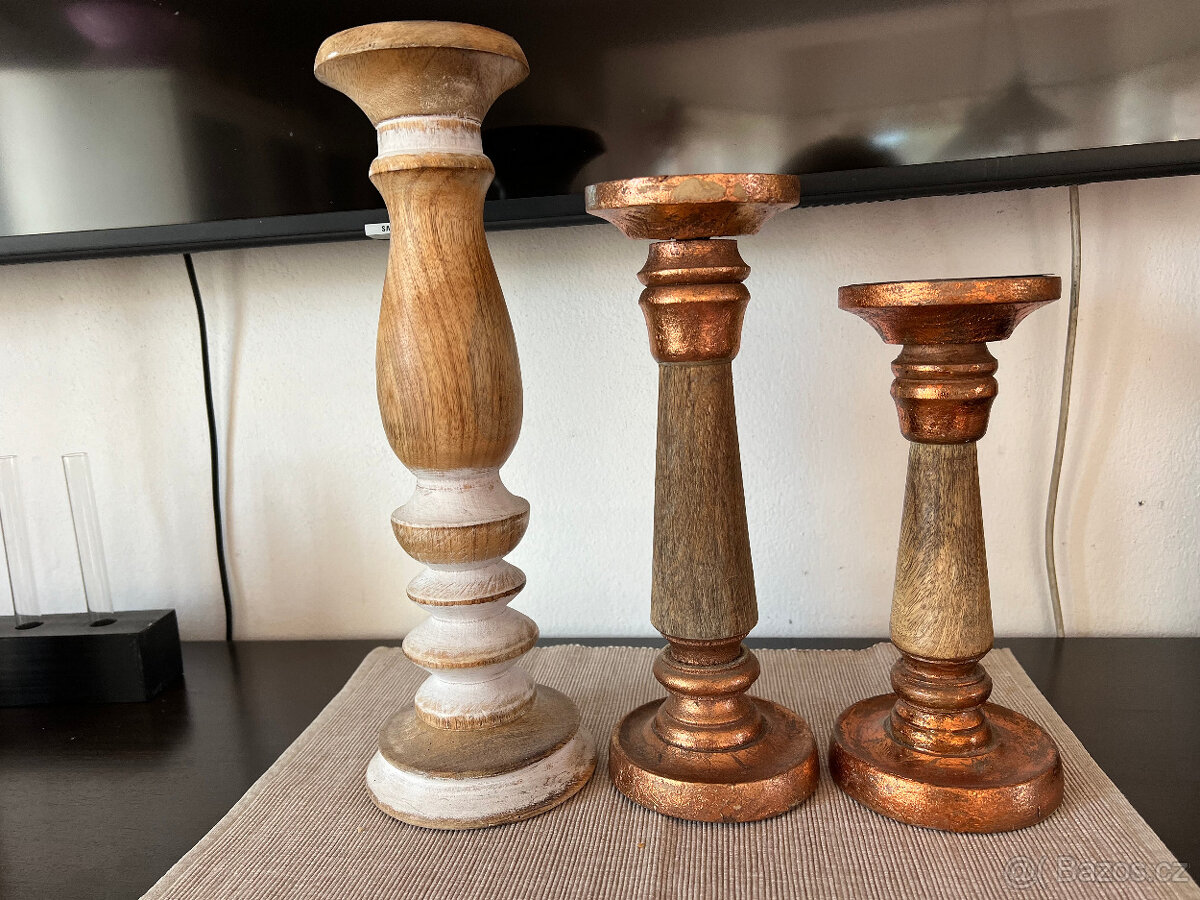 Dřevěné svícny moderní, krásné, 3 kusy. Rozměry - velký svícen 37,5cm, na svíčku o průměru 7,5cm, dva nižší svícny vysoké 25,5cm a 30,5m, horní plocha 7,5cm. Stav jako nové, vhodné i jako dárek. Cena za vše, zašlu.