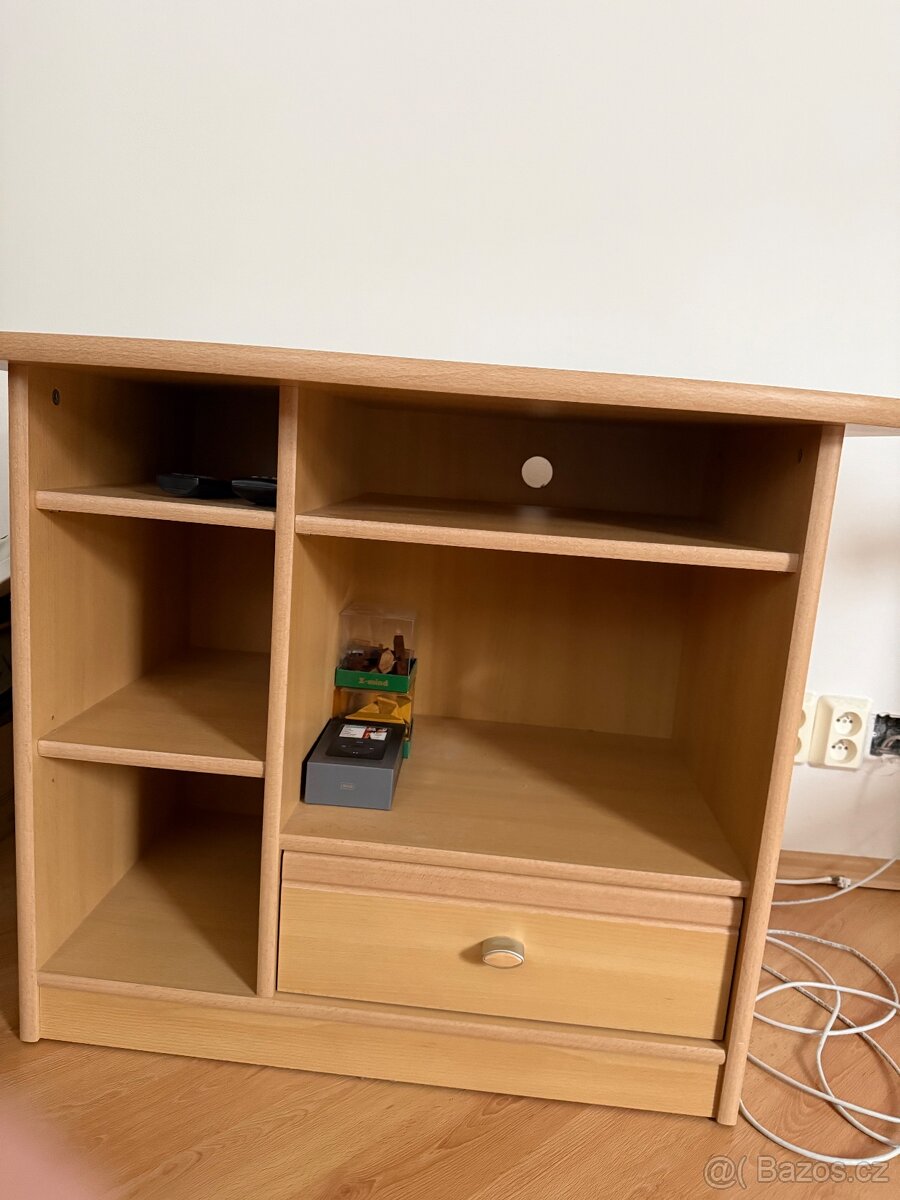 Televizní stolek - [6.2. 2026]V pěkném stavu. Bez poškození. Má 2 skříňky a 1 šuplík. Délka 160 cm, výška 40 cm, hloubka 48 cm. Prodej z důvodu stěhování. Možný prodej i televize LG 140 cm. Cena dohodou.