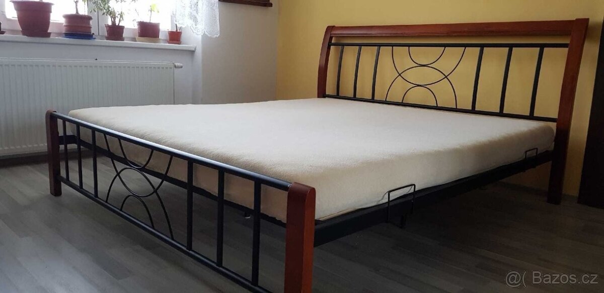 Kovová manželská postel, kombinovaná se dřevem, s roštem, bez matrace