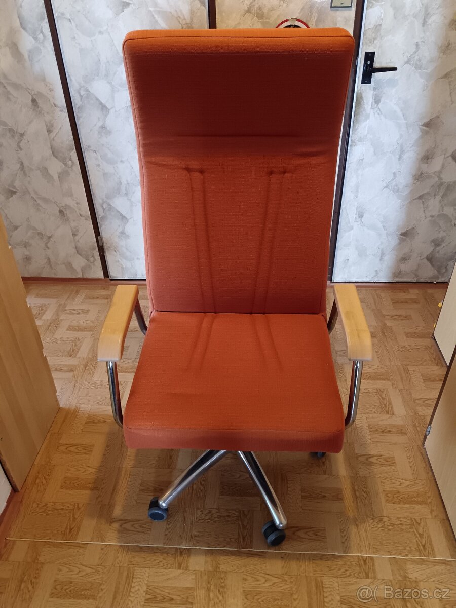 Prodám otočné křeslo SENIOR s nosností 150 kg, hliníkový kříž, korpus s podušky, čalouněné potahovou látkou, nastavení výšky sezení plynovým perem, pogumovaná kolečka pro tvrdé podlahy, bukové područky.