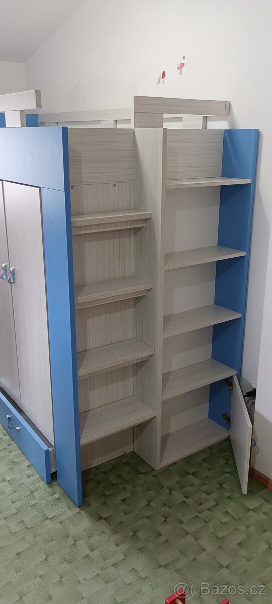 Prodám dětskou patrovou postel se skříní, policemi a psacím stolem. Rozměry 200 x 90 x 166 cm. Lehce ťuklá přední hrana u psacího stolu viz foto. Postel je rozebraná na tři díly tudíž se dá snadno přepravit a následně lehce smontovat. Pouze osobní odběr. 7️⃣2️⃣5️⃣7️⃣1️⃣6️⃣2️⃣7️⃣6️⃣