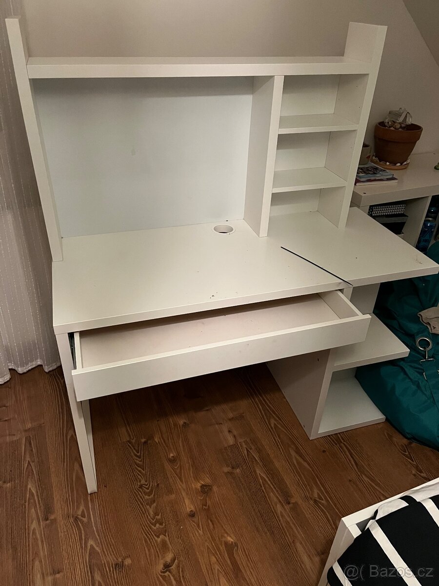 Další kus je psací stůl s otvorem pro odložení věcí s malým šuplíkem,známky stáří cca 10 let,škrábance, místy zažloutnutí barvy ...