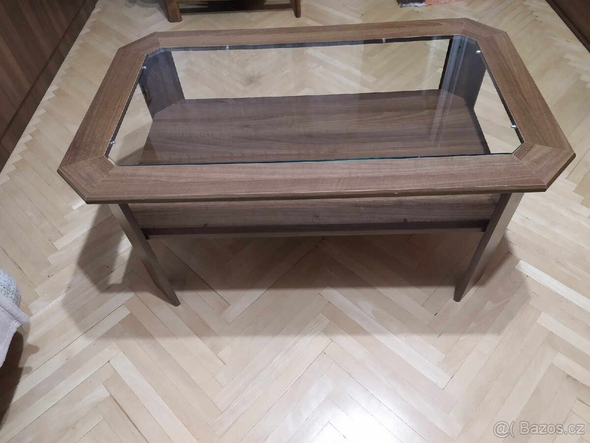 Prodám krásný konferenční stolek prosklený super stav ořech Aida rozměry šířka 104cm, hloubka 64cm, výška 51cm.puvodni cena 4900kč