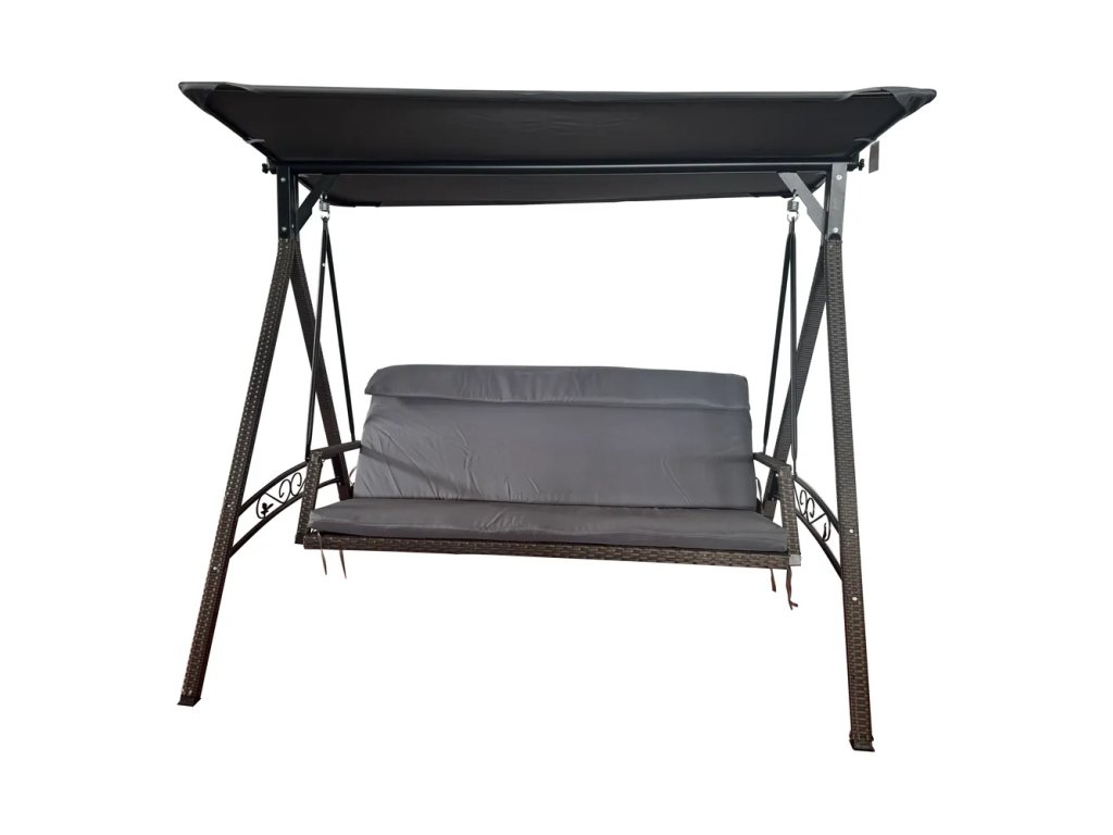 Z umělého ratanu, šedá, nosnost 270 kg, šířka 205 cm, výška 175 cm, hloubka 140 cm..Umělý ratan je odolný vůči UV záření, což zajišťuje dlouhou životnost a odolnost proti vyblednutí i při vystavení slunečnímu záření. Součástí houpačky je pohodlný podsedák v šedé barvě. Výška zadní opěrky 63 cm Materiál zavěšení Kov.Možno zaslat.