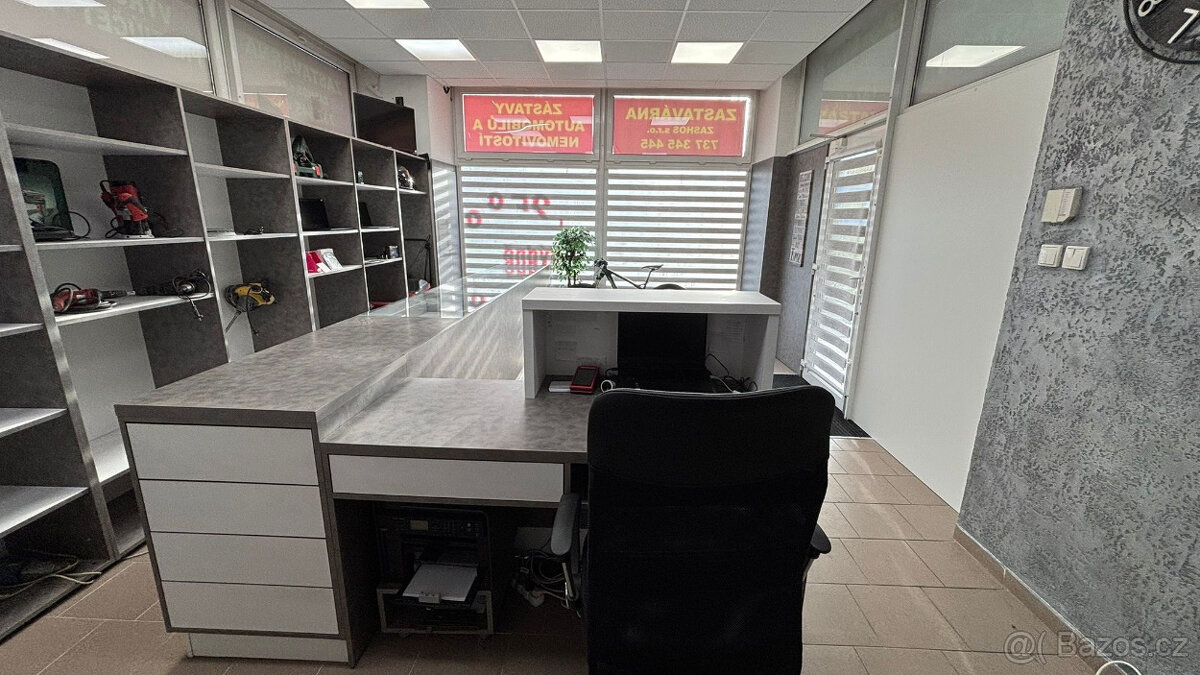 Prodám kompletní zařízení do obchodu / provozu prodejní pult s regálem. Pult se skelněnou výplní 4950x600 pracovní plocha 1450x600. Regál s policemi 5400x450x2075