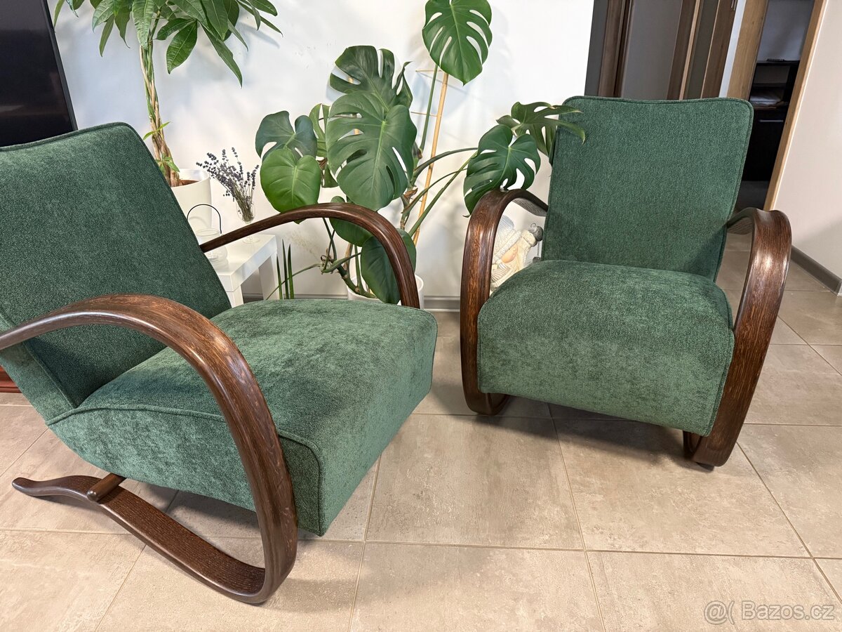 Prodám dvě vzácná křesla H-269 po renovaci ve svěží zelené, s tmavými ohýbanými područkami v barvě ořech.