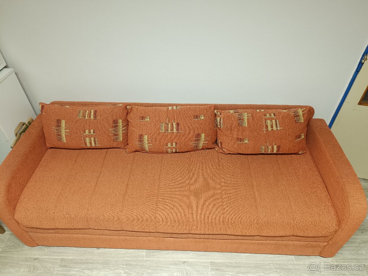 Prodám pohovku oranžové barvy. Rozkládací, úložný prostor, tři polštáře