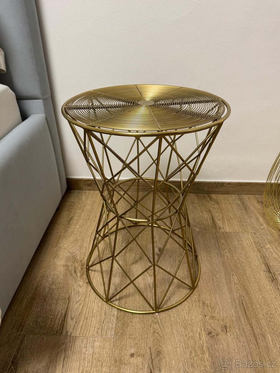 Prodám odkládací stolek zlaté barvy - výška 46, průměr 33cm. Při platbě předem možno zaslat Zasilkovnou (+89,-Kč)