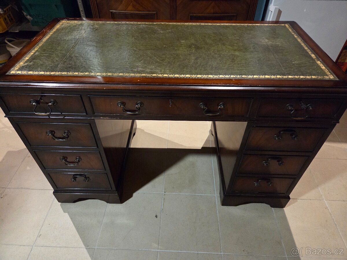 Prodám starožitný anglický psací stůl, z 50.-60 let s kůží vykládanou psací deskou a mosazným kováním, š-v-h: 122-77-61 cm. Ke stolu jsou originální klíče. Horní zásuvky jsou uzamykatelné a zámky plně funkční. Stůl se skládá ze 3 částí a je tak možné jej snadněji transportovat.