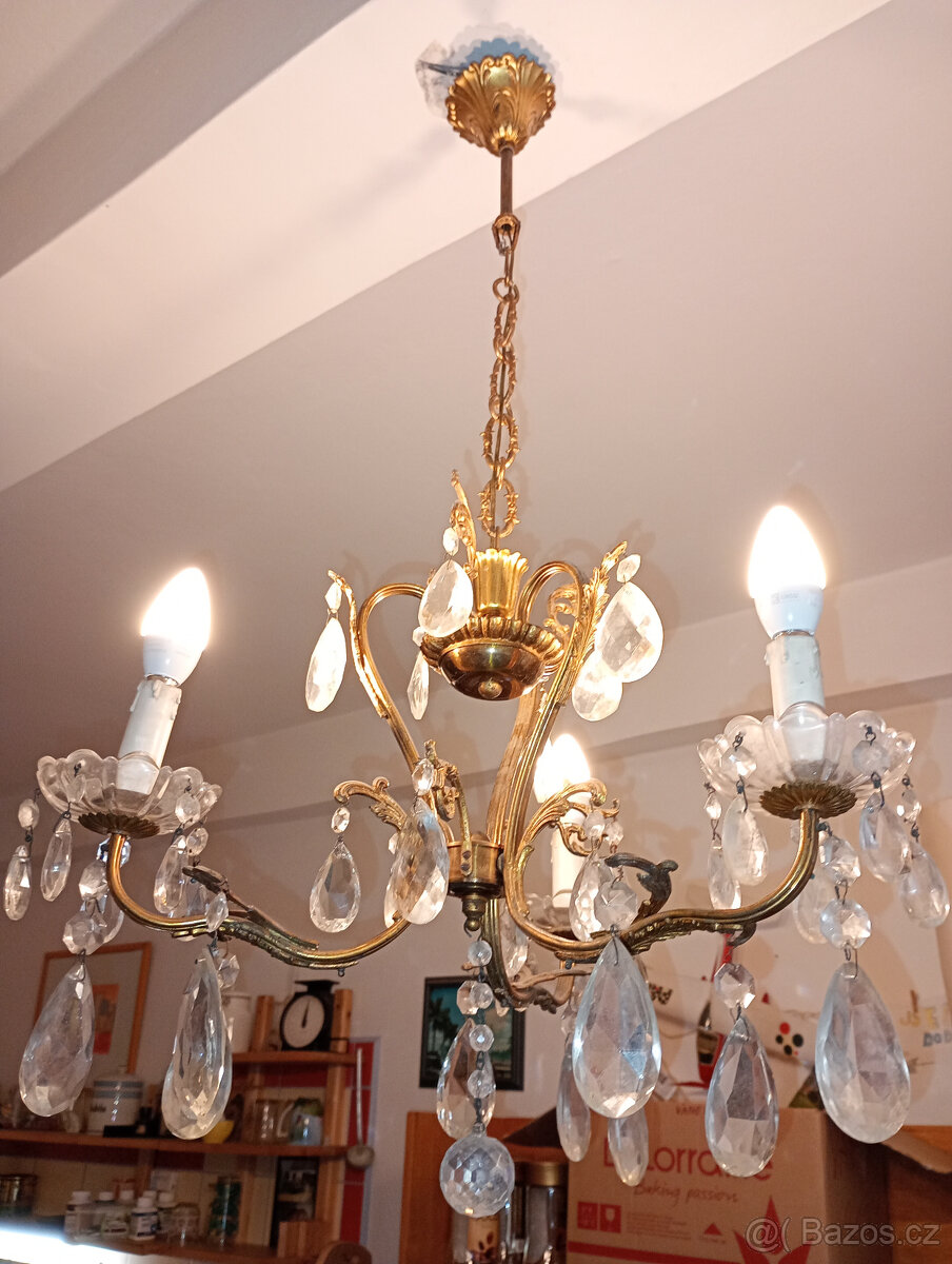 Hollywood Regency Crystal and Brass Chandelier Three Lights -vyrobeno cca 1955.Kabeláž zánovní,vše funguje,stále je v užívání.Lze jednoduše nastavit výška mezi 55 a 83 cm.Stav viz foto,ke shlédnutí Vršovice.Žárovky v ceně.PRAHA 10