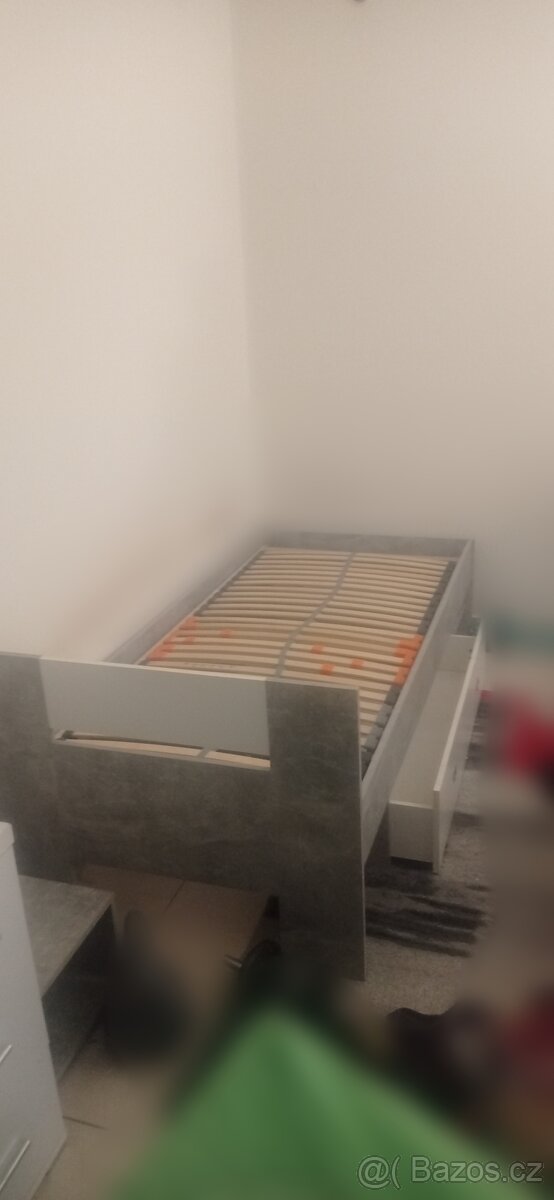Prodám jednolůžkovou postel v moderním šedém dekoru (imitace betonu).