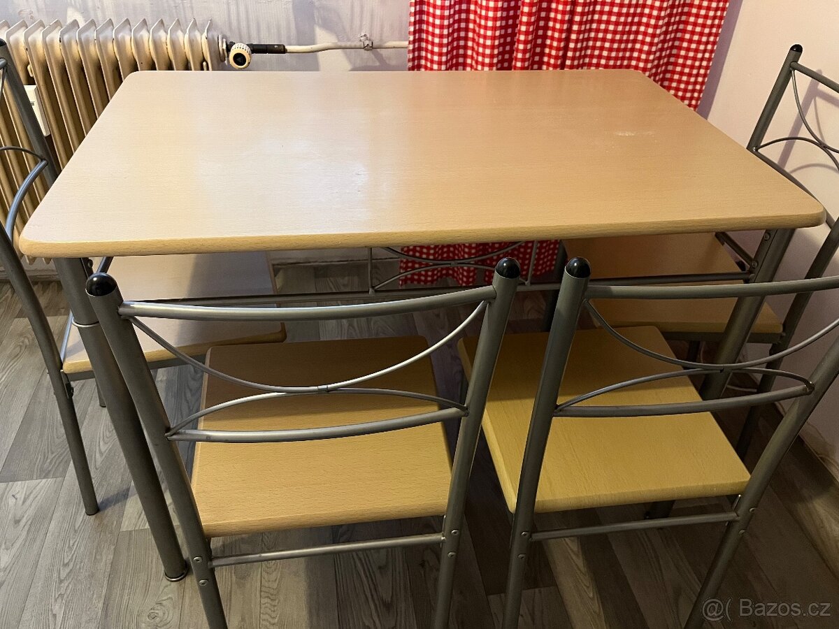 Prodám jídelní stůl a čtyři židle. Rozměry stolu 70x110, výška 77. Velmi zachovalé.