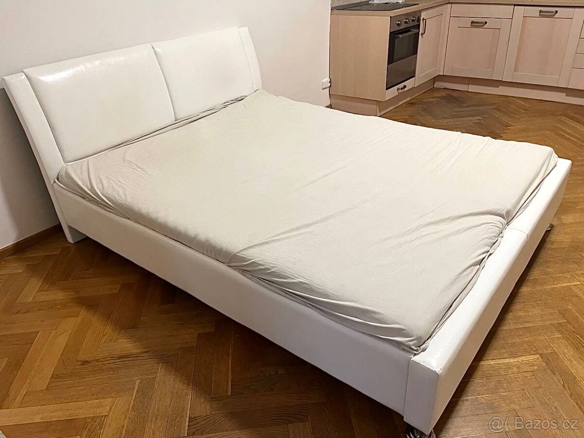 Dvoulůžková postel s měkkým bílým čelem a rámem + matrace.
