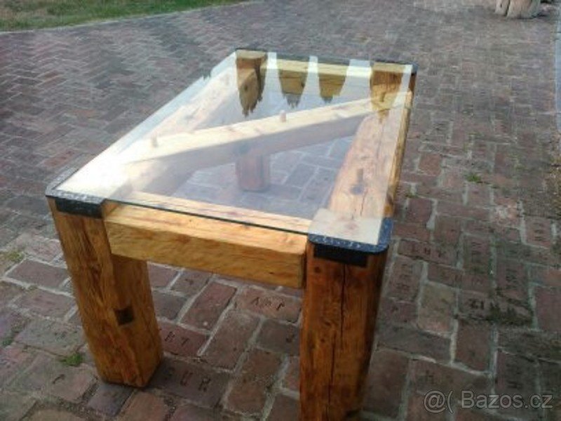 Prodám stůl ze sto let starých tesaných trámů (Krkonoše a Jizerské Hory).10mm silné tvrzené sklo,D.162 Š.100 V.82cm. Váha 140.kg, čepované, ošetřené lněným olejem.