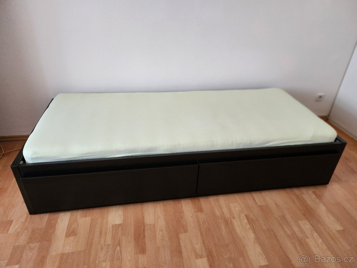 Prodám jednolůžkovou postel IKEA, dvě zásuvky, rozměr 80x200cm, včetně roštu a matrace.