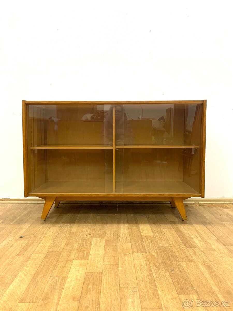Retro komoda /knihovna Jiří Jiroutek 60. léta - [7.2. 2026]Prodávám unikátní retro skříňku na vysokých bruselských nožkách, výroba ČSSR 60. léta Interiér Praha, design Jiří Jiroutek, provedení světlá dýha odstín dub, elegantní bruselské nožky, posuvná skla, jedno černé s modrými trojúhelníky, vnitřní police. ...