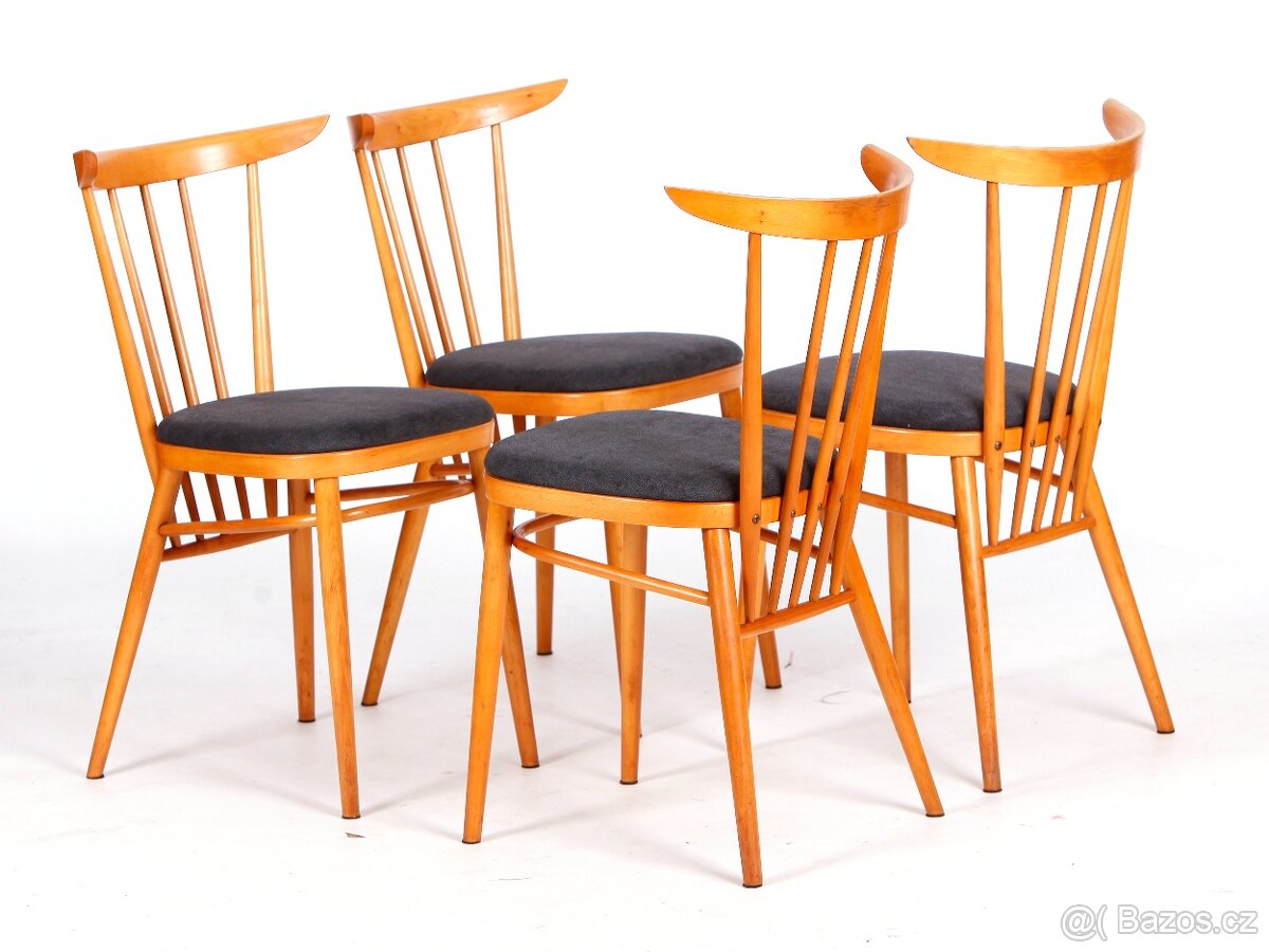 Krásné retro židle slovenské výroby značky TATRA. Velmi dobře zachovalý původní stav s nově přečalouněnými sedáky. Pevné, stabilní bez stop po červotočovi. Připraveny ihned k použití.