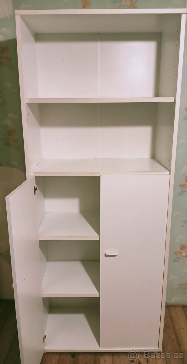 Prodám starší skříň z IKEA v bílé barvě – již se nevyrábí, vhodnou do pracovny, dětského pokoje nebo garáže – je ovšem stará ,zašlá a špinavá viz foto takže spíše do dílny apod. Horní část obsahuje otevřené police, spodní část kombinuje uzavíratelné skříňky s policemi. Celkově pevná konstrukce.