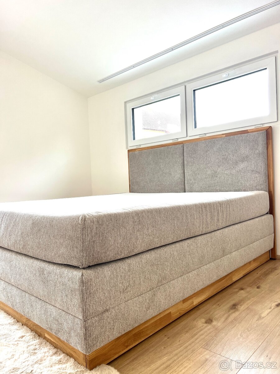 Nová boxspring postel semiš 180x200 cm - [7.2. 2026](Vystavený kus). Potah semiš - kompletně sundavací a pratelný (i potah čela). Taštičková matrace (doporučujeme přikoupit Topper). Lůžko: 180x200 cm, čelo: 125x182 cm, výška lůžka: 60 cm, tloušťka matrace: 21 cm.