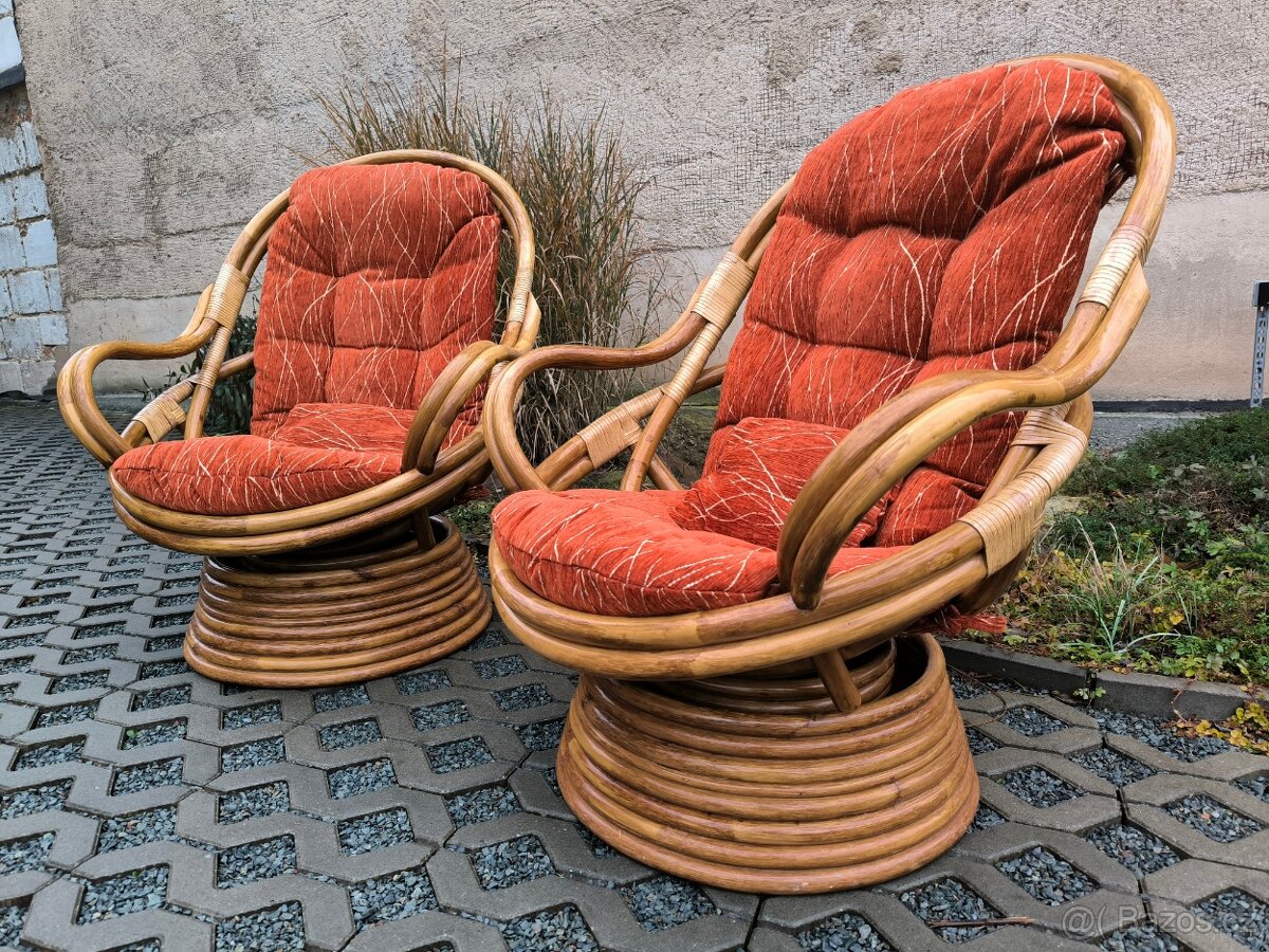 Prodám celkem 2 kusy ratanových křesel včetně sedáků a polštářků ve velice zachovalém stavu. Křesílka jsou v krásném stavu, ratan nepopraskaný, konstrukčně naprosto v pořádku, čalounění čisté a nepotrhané, z nekuřáckého prostředí. Křesílka nejsou otočná ani polohovací. Rozměry: 85 x 80 x 100 cm (Š x H x V). Cena uvedena za obě křesílka.