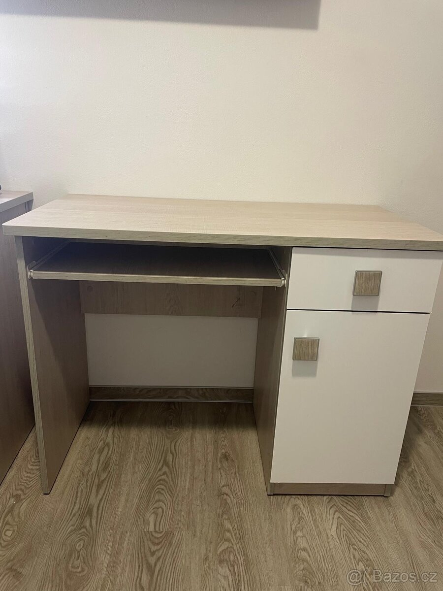 Jako nový, zezadu skříňky jen vyvrtaná díra kvůli zásuvce, která byla za stolem. Pod bílým polepem dvířek je fialový dekor. Masivní pevná konstrukce.