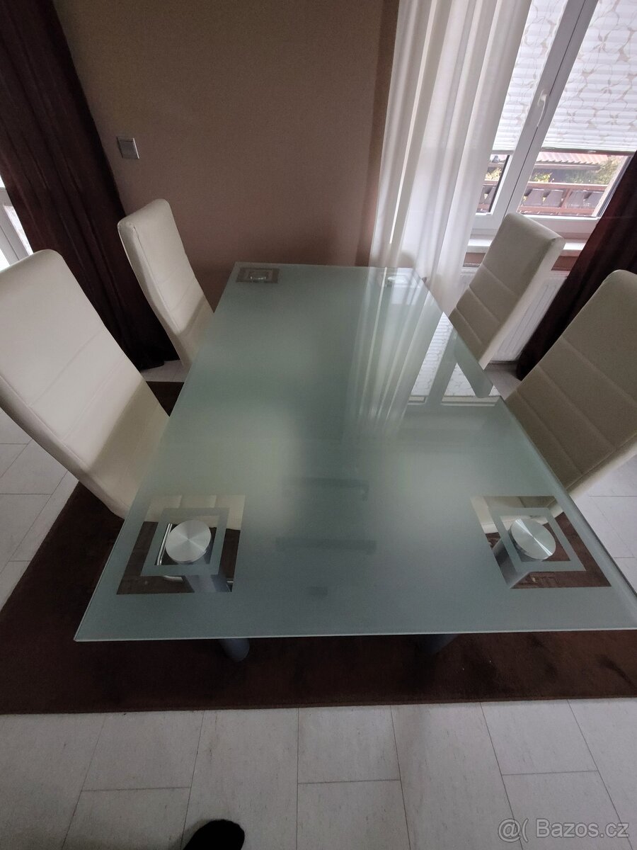 Prodám jídelní set, skleněný stůl 160x90x76 a 4 béžové židle. Vše za 1 200 Kč.