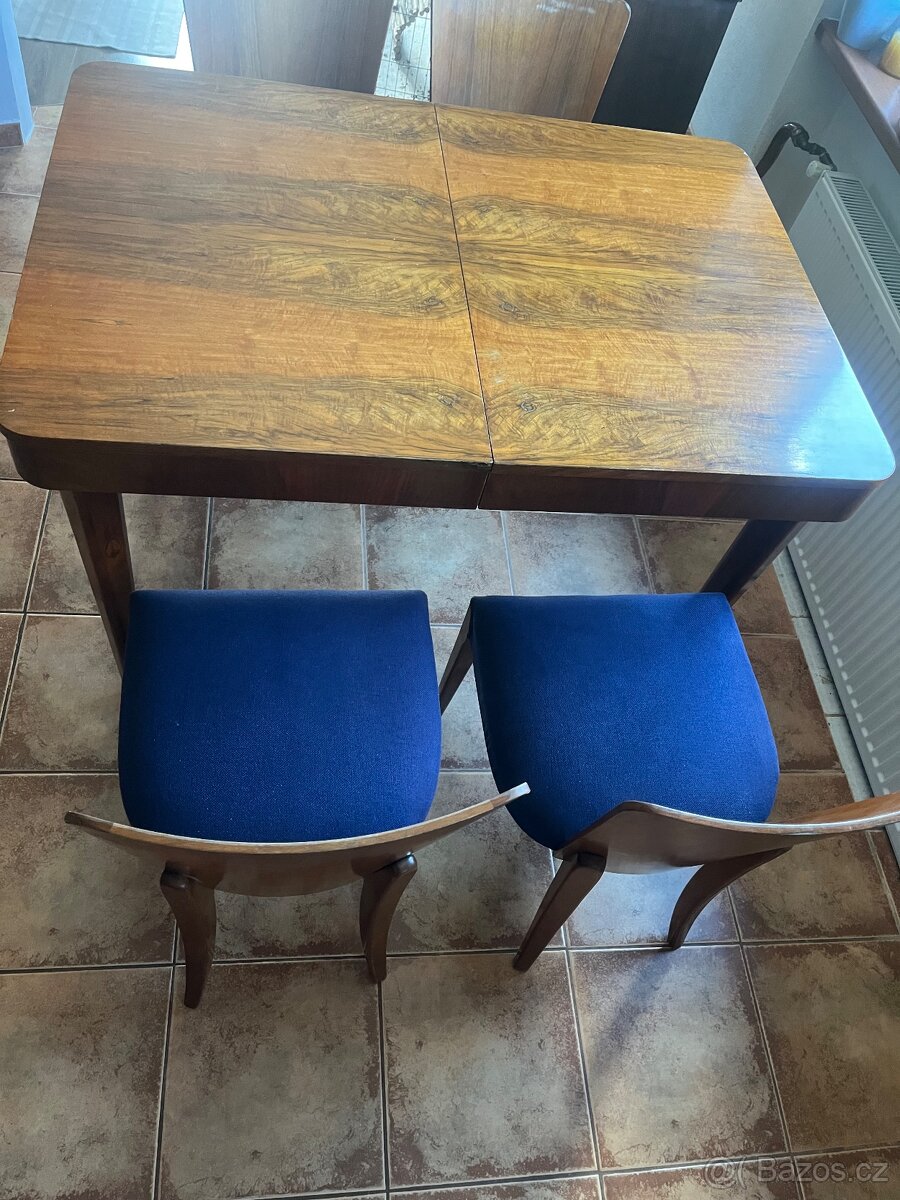 Jídelní rozkládací stůl se židlemi z roku 1952 - [4.2. 2026]Prodám jídelní rozkládací stůl se židlemi z roku 1952. Stav viz foto, jedna židle potřebuje opravit podsedák ve spodní části, viz foto. Ve složeném stavu se tam vejde šest lidí, rozměry: šířka - 85 cm, délka - 120 cm, výška - 76 cm. Ve rozloženém sta ...