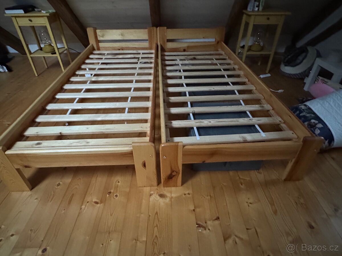 Prodám dřevěné postele včetně dřevěných roštů, moh přidat i matrace. Rozměry 2000/800. Postele nevržou, nikde žádný problém. Jsou rozložené, vše k tomu mám. Byly jednou složené a jednou rozebrané. 2ks.