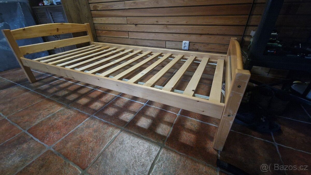 Prodám dvě použité postele s matrací 90×200, borovice masiv, matrace ikea pružinová tvrdá, půl roku stará, cena rám postele 500 Kč matrace 1000 Kč