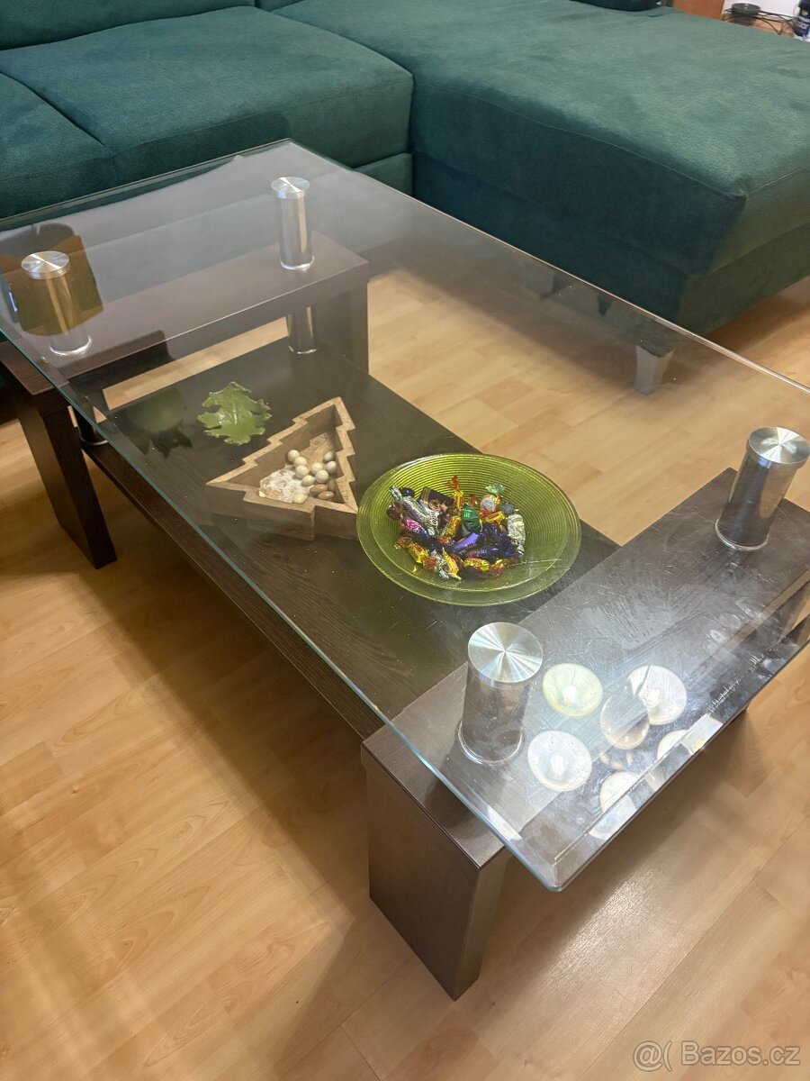 Spodní část je v dekoru wenge, horní deska je skleněná. Stolek je delší dobu používaný, na skle se mohou nacházet drobné rýhy, nicméně celkově působí zachovale a stále dobře vypadá.