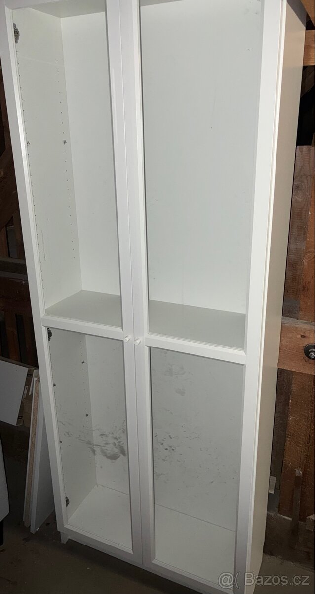 Vitrína s prosklenými dveřmi. Původně ikea billy/oxberg za 3400kc. Včetně polic. 200x80x30cm. Z čelní strany lehce podřena, přelepeno bílou páskou.