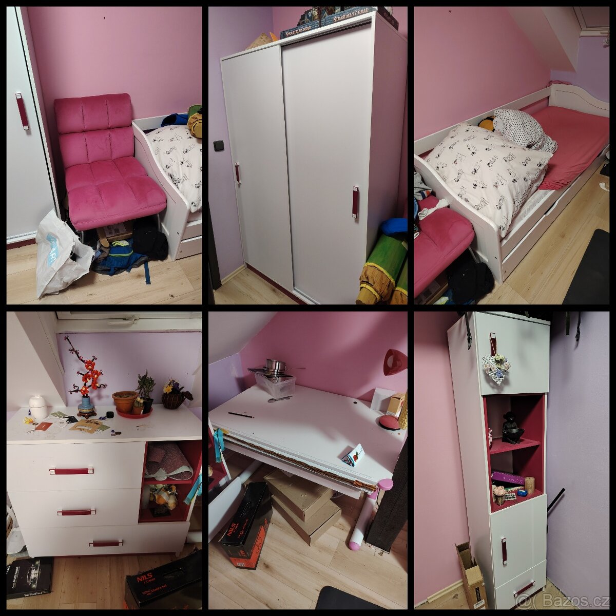 Prodám kompletní nábytek do dětského pokoje v bílo-růžovém provedení. Nábytek je ve velmi dobrém stavu, běžné známky používání, nic rozbitého.