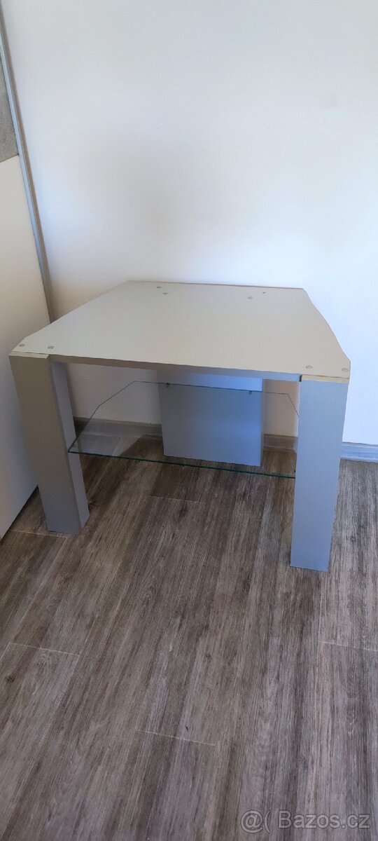 Šedý televizní stolek výška 54cm šířka vepředu 74cm vzadu 50cm uprostřed sklo k vidění a odběru ve Valašských Kloboukách