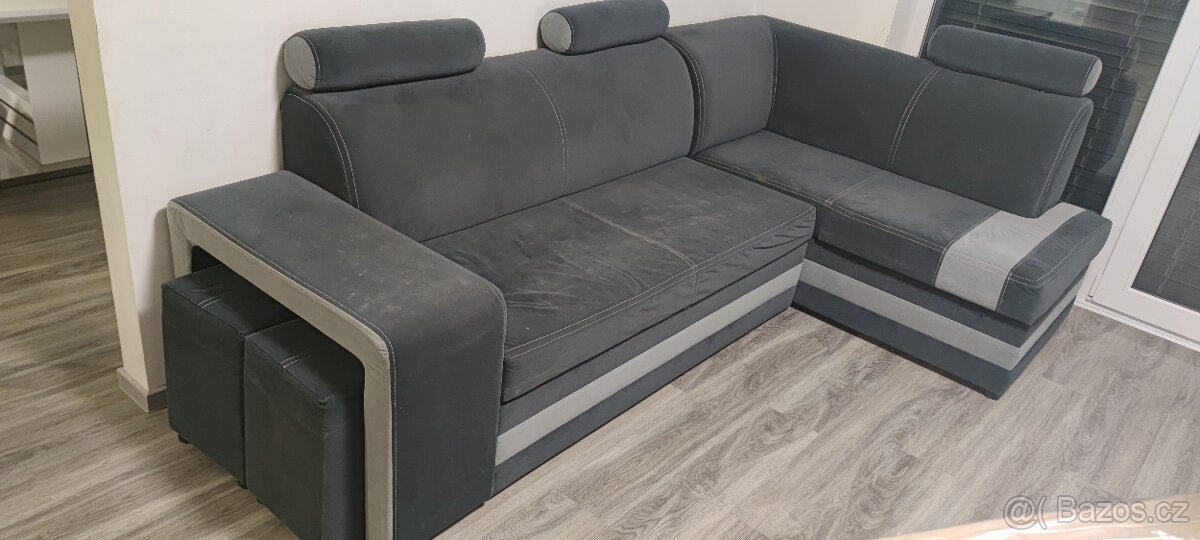 Prodám rohovou rozkládací sedačku s uložným prostorem + 2x taburet,2x polštářek, nastavitelné opěrky hlavy. Znečištěná od dětí (lze vyčistit) + nutno přešít jeden šev viz foto.