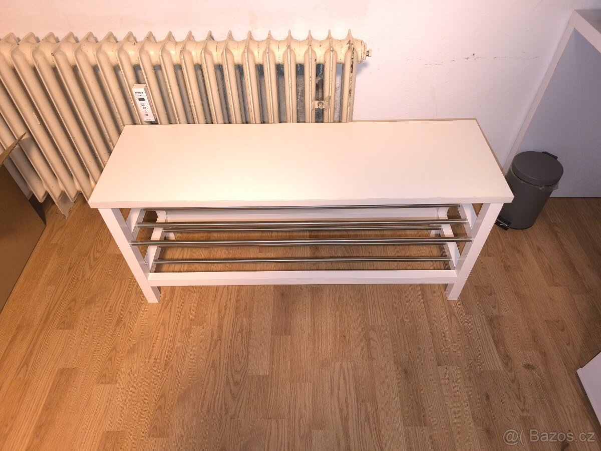 Prodám praktický botník v bílé barvě s kovovými tyčemi na boty. Lze využít i jako lavici k sezení při obouvání. Vhodný do předsíně, chodby nebo šatny.