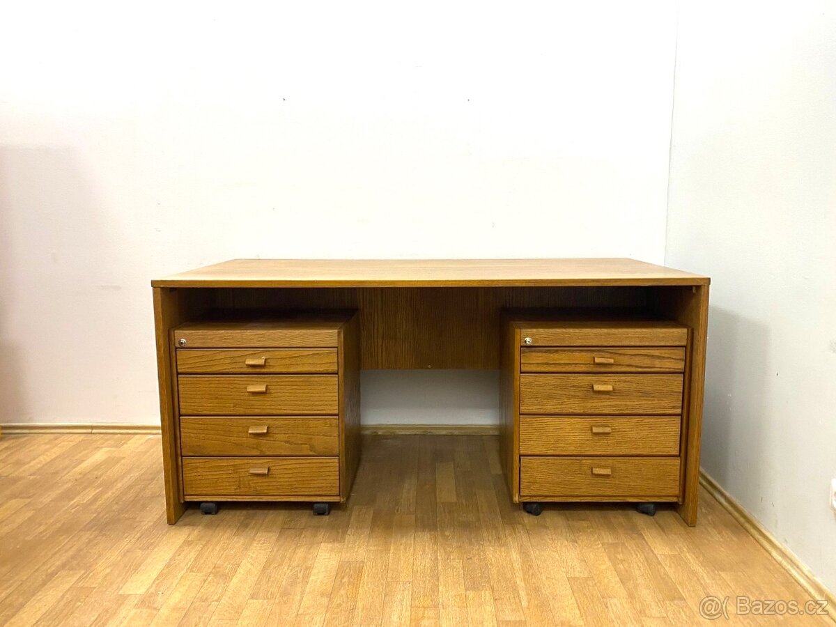Prodávám stylový, velkorysý retro psací stůl, výroba ČSSR 80. léta, provedení dýha s krásnou kresbou, jednoduchý tvar dvoje oddělitelné, uzamykatelné šuplíky na kolečkách. Původní, zachovalý stav, možno ihned používat, drobné oděrky odpovídají stáří, rozměry: výška 75 cm, deska 80x160 cm. Cena 2800,-Kč, možnost dopravy.