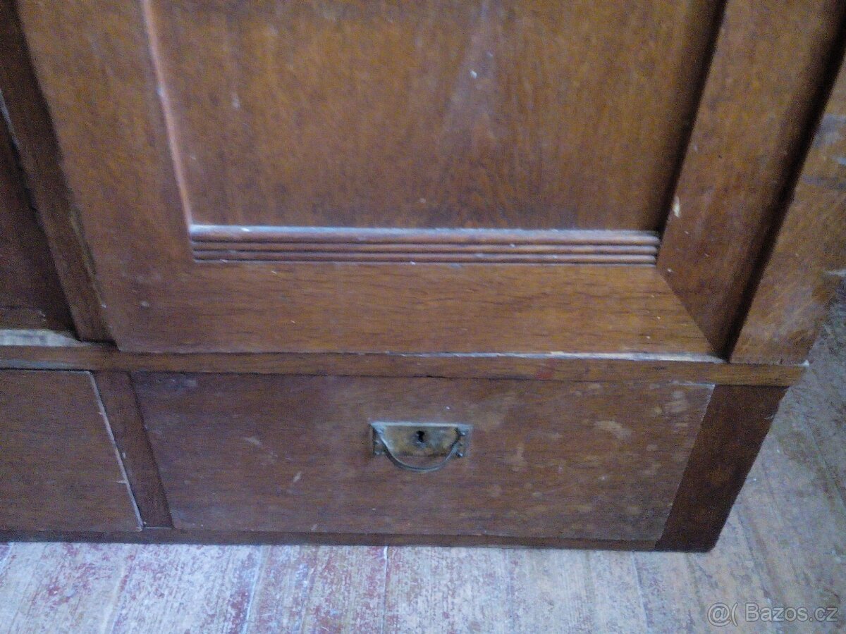 Velká šatní skříň - [13.1. 2026]Prodám velkou šatní skříň. Krásné lité prvky - držáky deštníku a věšáky. Secese secesní masiv historická
